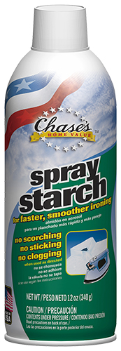 Chase’s Home Value™ Starch sprays on for faster, smoother ironing. Adds crispness to any washable fabric. Fabric can be wet or dry.