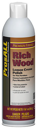ProsALL® RichWood™ Lemon Crème Polish cleans and protects wood surfaces, giving them wax-free protection, and leaving them showroom bright and with a renewed lustre. This formulation of natural ingredients makes it the reliable choice to impart a protective gloss to surfaces.
